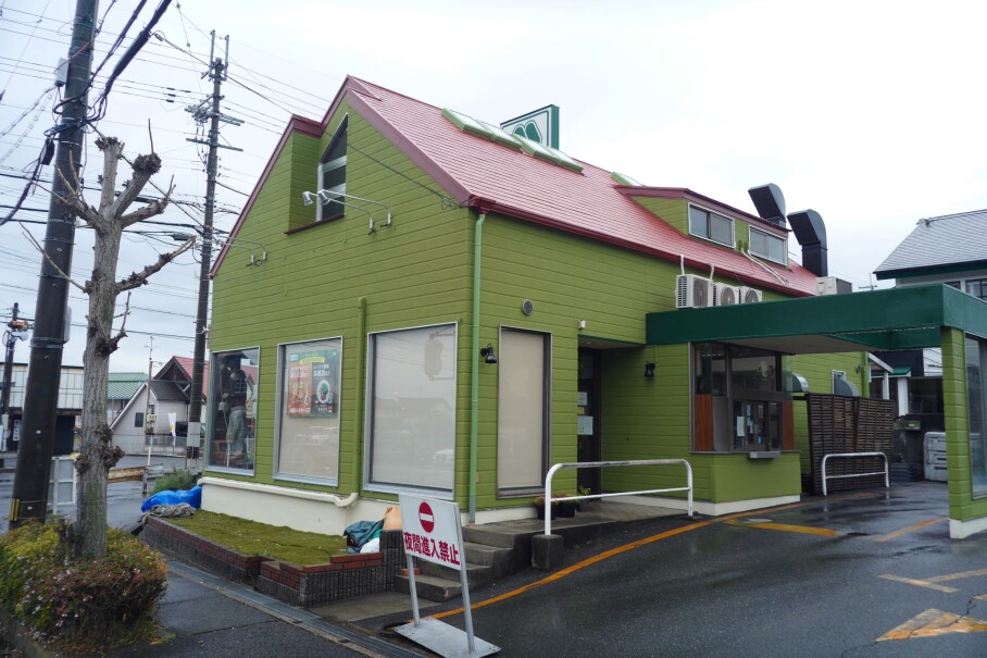 明るめの緑の外壁と赤色の屋根、そしてモスバーガーイメージカラーの濃い緑色がアクセントになっています。