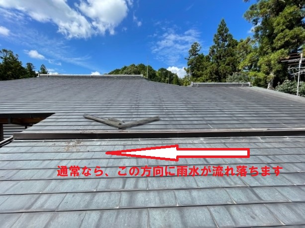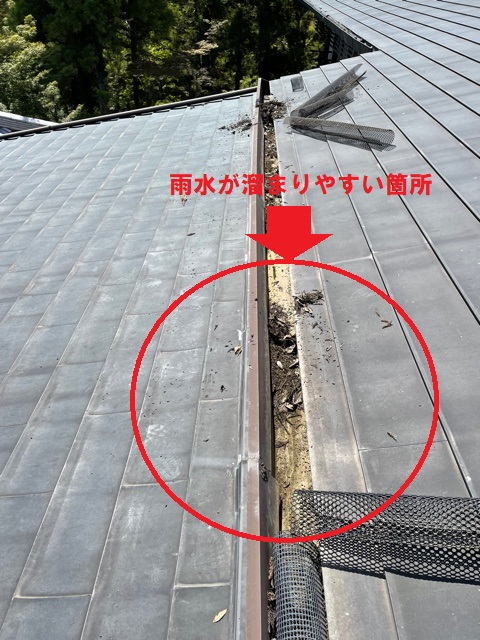 雨樋に雨水が流れ込んだ後、通常なら樋の下の方へ流れますが、勾配が緩いことで、雨水が途中で溜まってしまうのです。